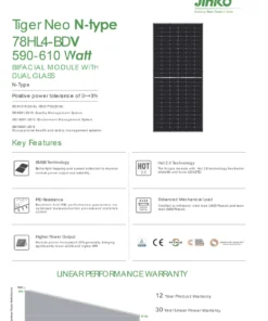 The Jinko 560W Tiger Mono Facial solar panel is a 560W monocrystalline module with 144 cells from Jinko Solar, one of the world’s leading manufacturers of the photovoltaic industry. Jinko solar panels come with a 12-year product warranty and a 25-year linear power warranty.